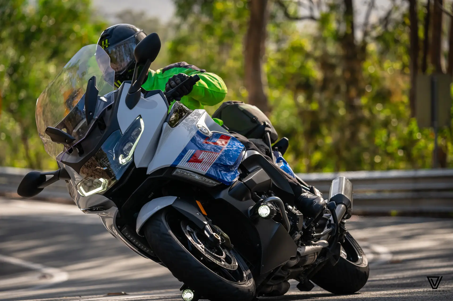 Cruise control on. Windscreen up. The electronically adjustable fairing cocoons you in silence. 80 mph feels like 40. The world blurs past, but you feel like you're gliding in a low-flying fighter jet. Stable. Precise. Effortless.